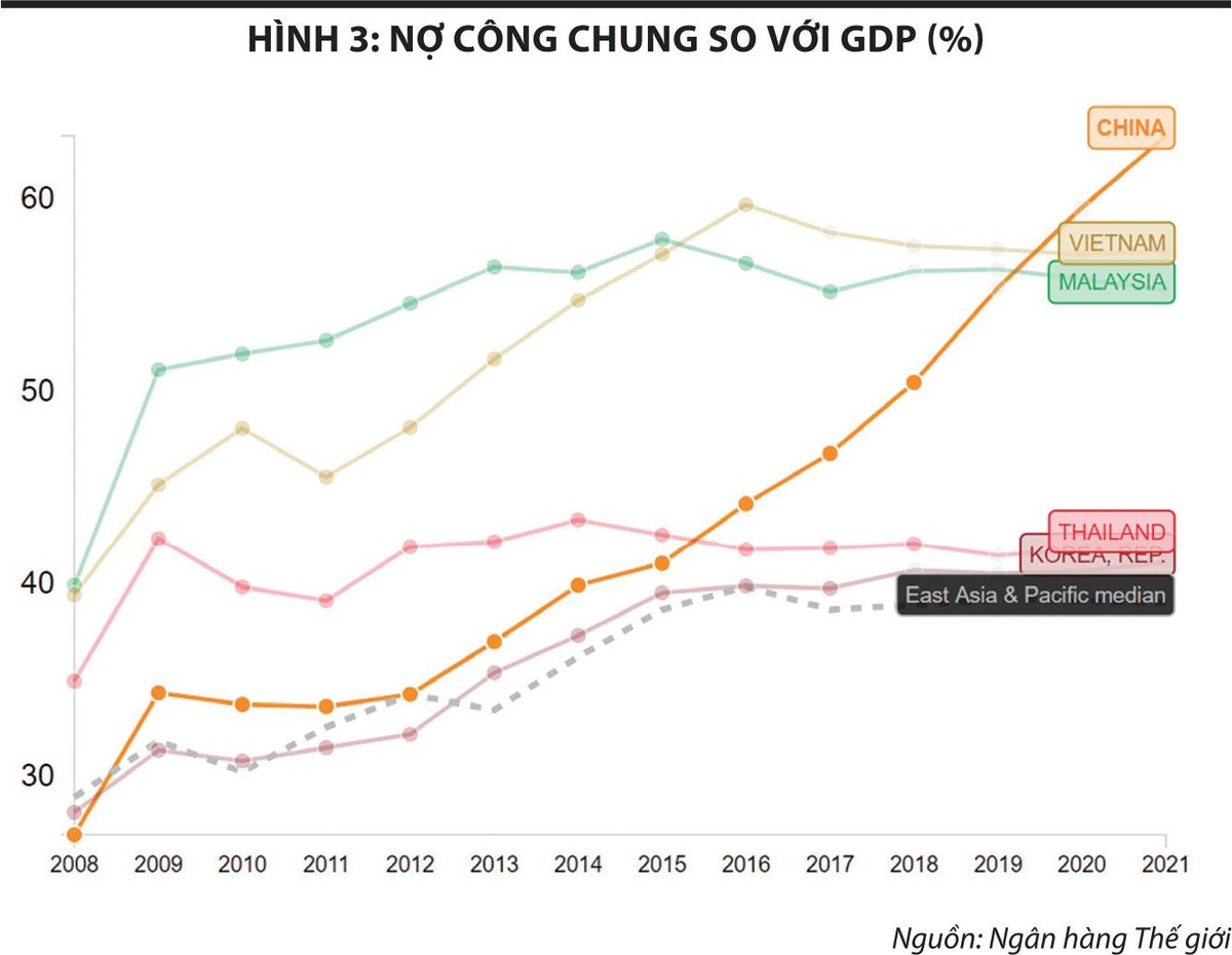 Hình 3 cho thấy tỷ lệ nợ công so với GDP trên hầu hết các nước trong khu vực châu Á - Thái Bình Dương (và thậm chí trên toàn thế giới) đã tăng lên rất nhanh trong hơn 10 năm qua. Theo lý thuyết, việc gia tăng mạnh mẽ nợ công sẽ tạo ra hiệu ứng lấn át (nhà nước cạnh tranh nguồn tiền nhàn rỗi trên thị trường với tư nhân) dẫn đến lãi suất phải tăng cao hoặc lạm phát gia tăng.