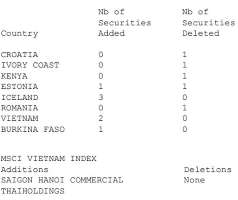 Như vậy, số lượng cổ phiếu thành phần danh mục của MSCI Frontier Markets Index - chỉ số tham chiếu cho quỹ MSCI Frontier Markets Index ETF tăng lên 81 mã. Đây là 81 cổ phiếu thành phần được xem xét từ các cổ phiếu có giá trị vốn hóa lớn và trung bình từ 28 quốc gia trong thị trường cân biên – Frontier Market (FM).