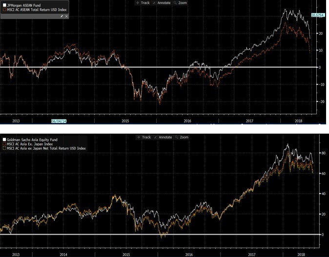 Dưới đây là đồ họa kết quả đầu tư của J.P. Morgan ASEAN Fund và Goldman Sachs Asia Equity Funds – hai quỹ đầu tư chủ động danh tiếng – so với các chỉ số mà họ tham chiếu.