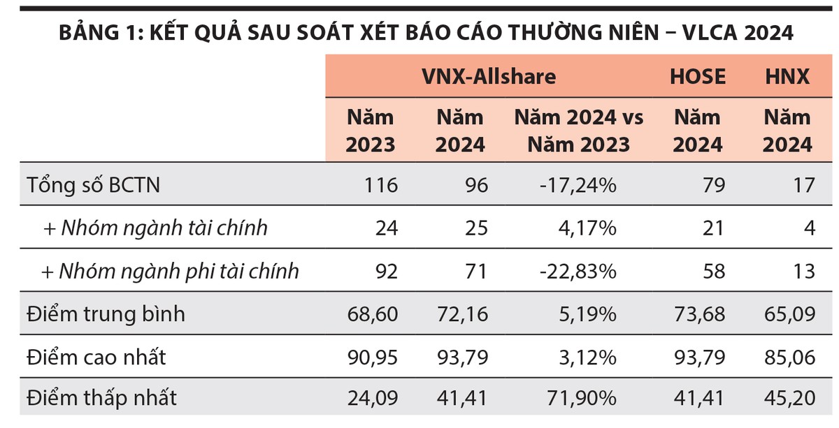 Số lượng báo cáo thường niên được đánh giá năm 2024 là 96 báo cáo, giảm 20 báo cáo (-17,24%) so với năm 2023, chủ yếu giảm từ nhóm phi tài chính.