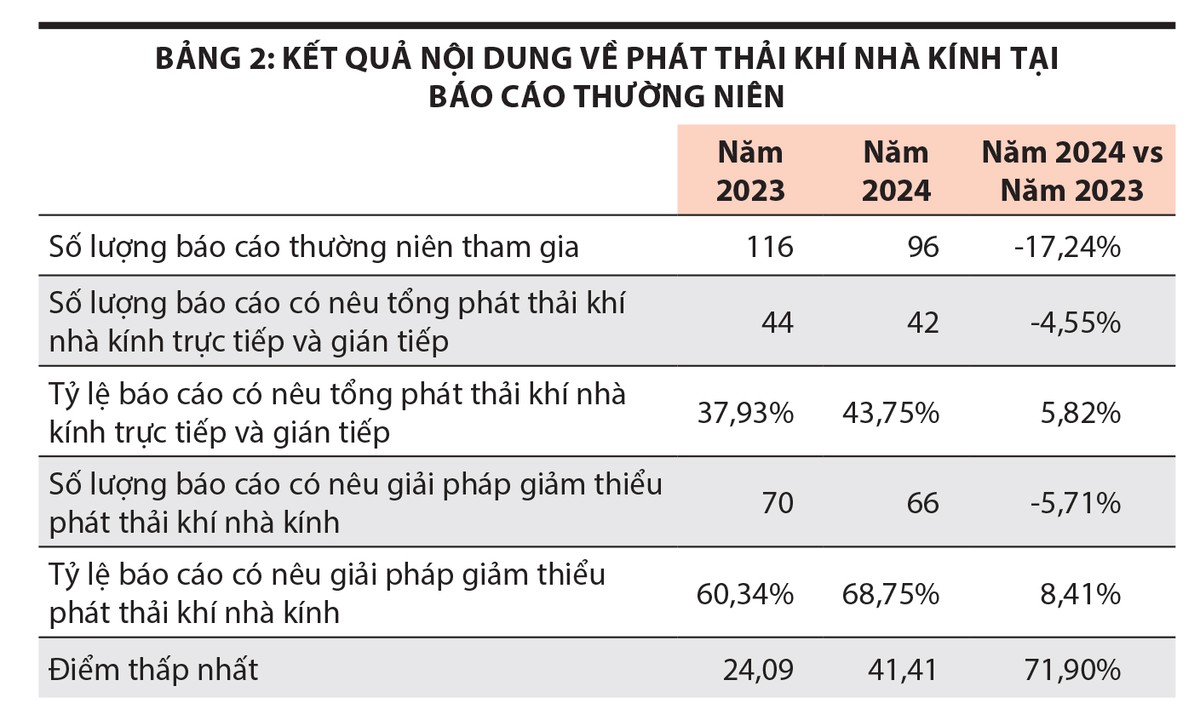 Năm 2024 là năm thứ hai bộ tiêu chí đánh giá báo cáo thường niên gồm câu hỏi bắt buộc về việc công bố thông tin tác động môi trường của công ty. Năm nay, số lượng báo cáo đề cập giải pháp giảm thiểu phát thải khí nhà kính giảm nhẹ so với năm ngoái do số lượng tham gia giảm, tuy nhiên, xét về tỷ lệ số báo cáo công bố nội dung này trên tổng số báo cáo tham gia, các tỷ lệ này đều tăng, cho thấy nhiều doanh nghiệp tham gia hạng mục có sự đầu tư trình bày về nội dung môi trường - xã hội trên báo cáo thường niên nhằm truyền tải thông tin của doanh nghiệp cho cổ đông và nhà đầu tư.(Bảng 2)