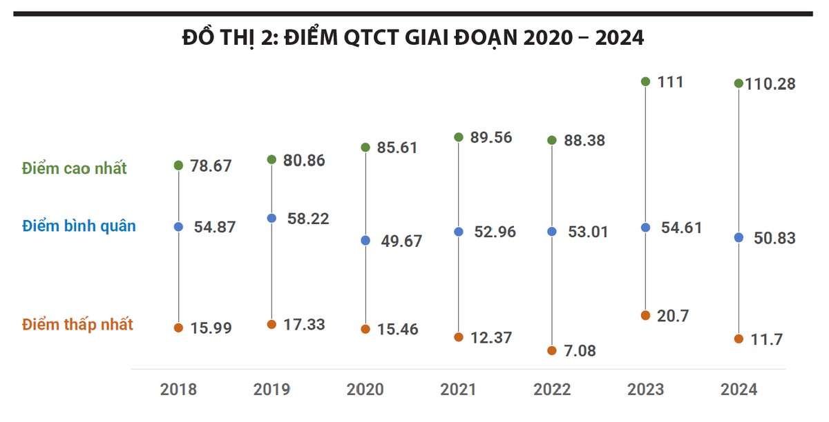 Bộ tiêu chí đánh giá chất lượng quản trị công ty được xây dựng theo hai cấp độ: 1. Tuân thủ các quy định pháp luật hiện hành của Việt Nam về quản trị công ty, dành cho công ty đại chúng và; 2. Áp dụng các thông lệ tốt về quản trị công ty. Năm 2024, với sự thay đổi trong cơ cấu điểm chấm, kết quả điểm của các doanh nghiệp cũng có sự thay đổi: (bảng 3)