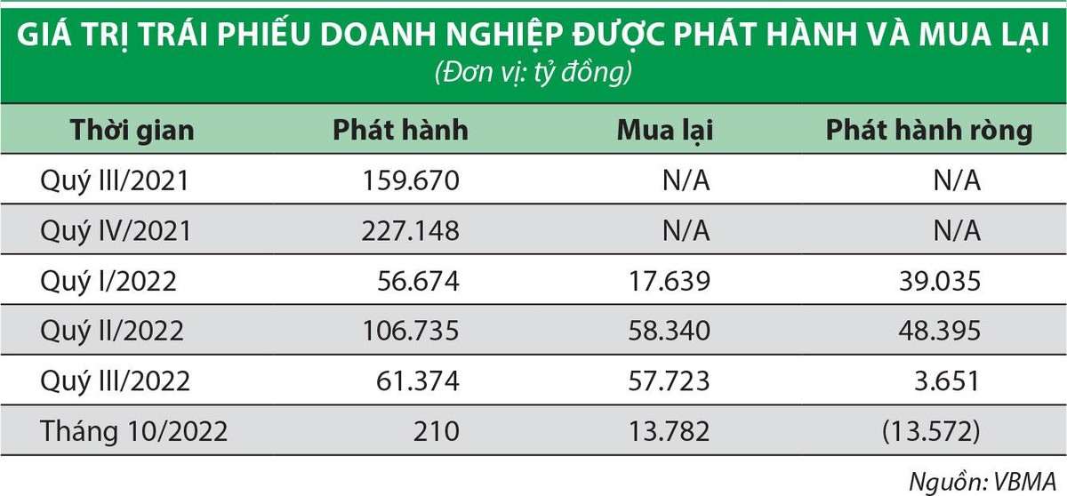 Theo Hiệp hội Thị trường trái phiếu Việt Nam (VBMA), trong 3 quý đầu năm 2022, các doanh nghiệp đã mua lại 133.702 tỷ đồng trái phiếu trước hạn. Trong tháng 10, các doanh nghiệp mua thêm 13.782 tỷ đồng, lũy kế 10 tháng đạt 147.484 tỷ đồng, trong khi chỉ có 1 doanh nghiệp huy động thành công 210 tỷ đồng trái phiếu.