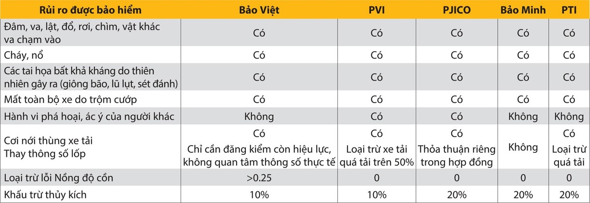 Thực tế, tại Việt Nam, tình trạng ngập úng cục bộ sau những cơn mưa lớn thường xuyên diễn ra ở các đô thị lớn như Hà Nội, TP.HCM…, cho nên sản phẩm bảo hiểm xe được nhiều người quan tâm. Thế nhưng, nhiều chủ xe ô tô vẫn luôn băn khoăn không rõ trường hợp nào sẽ bị từ chối chi trả bảo hiểm bởi cách giải quyết bồi thường, giảm trừ bảo hiểm của mỗi nhà bảo hiểm khác nhau (xem bảng).