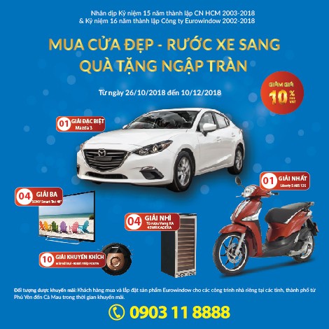 Nhân kỷ niệm 15 năm thành lập chi nhánh TP.HCM, chương trình “Mua cửa đẹp – Rước xe sang – Quà tặng ngập tràn” là lời tri ân đặc biệt Eurowindow dành riêng cho các khách hàng nhà riêng từ Phú Yên cho đến Cà Mau. Chương trình sẽ kéo dài từ ngày 26/10 đến 10/12/2018.