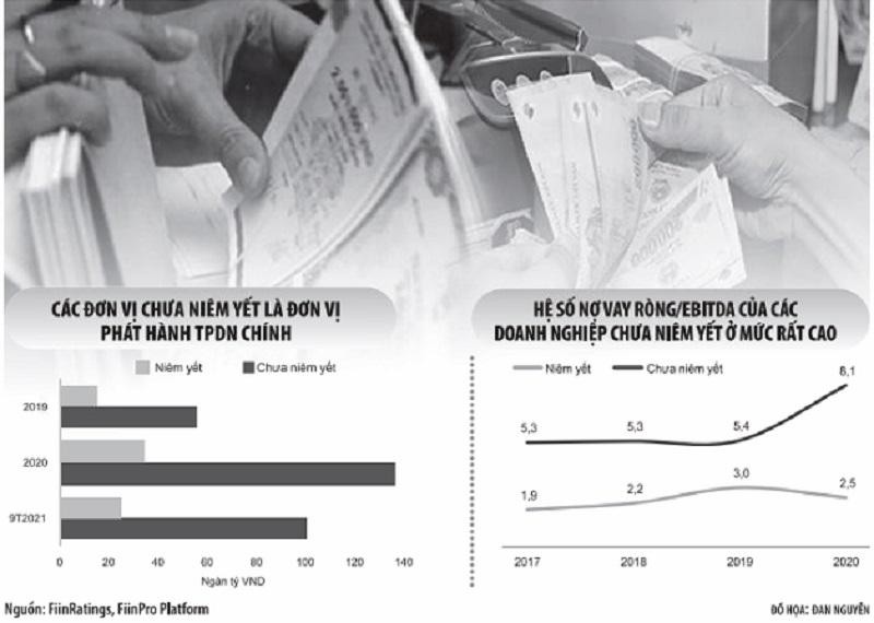 Theo thống kê của FiinRatings, 9 tháng năm 2021, lượng phát hành trái phiếu của doanh nghiệp bất động sản chưa niêm yết lên đến 100.000 tỷ đồng, gấp 5 lần doanh nghiệp niêm yết. Đáng lưu ý, hệ số nợ vay ròng/EBITDA của nhóm nhà phát hành này lên đến hơn 8 lần (nghĩa là nếu dùng dòng tiền hoạt động kinh doanh, doanh nghiệp mất hơn 8 năm mới trả được nợ).