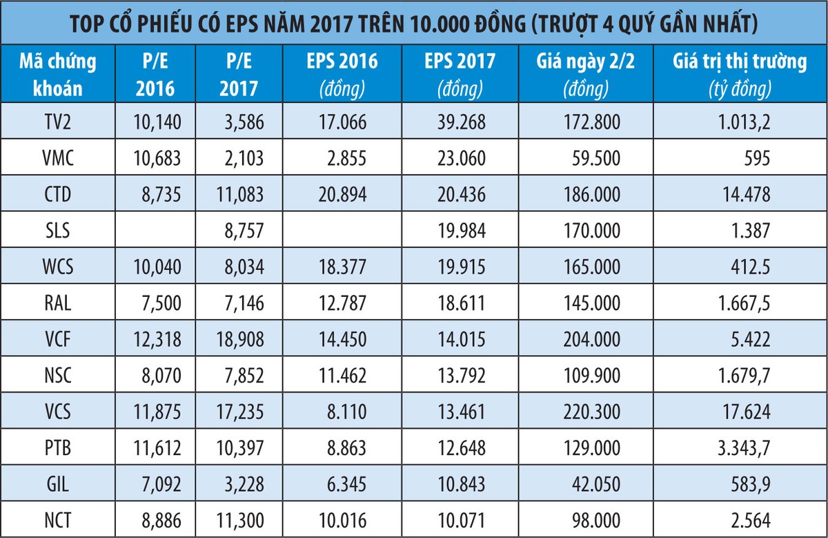 (ĐTCK) Theo thống kê sơ bộ đến hết tháng 1/2018, có 12 cổ phiếu có EPS trên 10.000 đồng/cổ phiếu, trong đó đa phần là những gương mặt quen thuộc, cùng với sự xuất hiện của một số tên tuổi mới. Điểm đáng chú ý là đa phần các cổ phiếu này đều thuộc những doanh nghiệp có hoạt động kinh doanh thuận lợi, thu về lợi nhuận tốt.