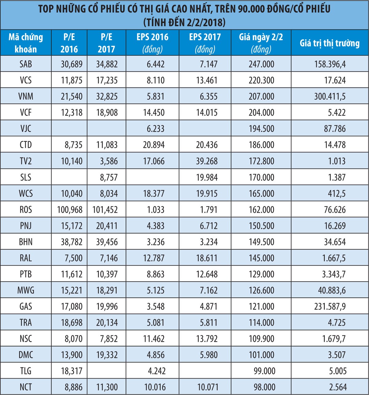 Thực tế, trong 2 năm 2016 – 2017, không ít doanh nghiệp có mức độ tăng trưởng EPS tính bằng lần. Bên cạnh đó, nếu như những năm trước, cổ phiếu có thị giá từ 200.000 đồng/cổ phiếu chỉ có CTD, thì năm nay đã xuất hiện thêm nhiều cổ phiếu nằm ở trên dưới ngưỡng này.