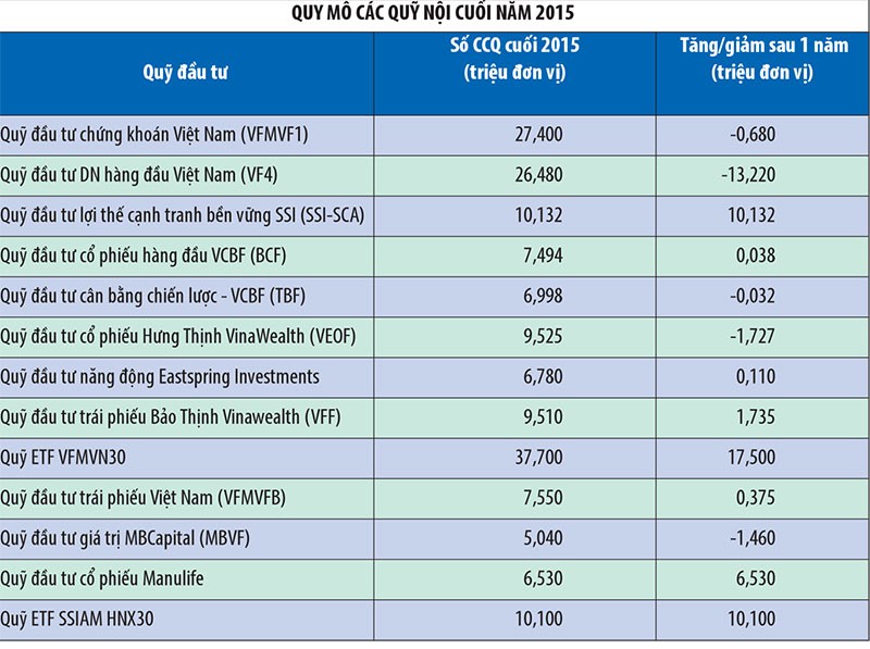 Trong số 13 quỹ nội địa theo khảo sát của ĐTCK, có 5 quỹ có giá trị tài sản ròng (NAV) năm 2015 giảm so với năm 2014. Trong đó, Quỹ đầu tư doanh nghiệp hàng đầu Việt Nam (VFMVF4) bị NĐT rút ròng 13,22 triệu chứng chỉ quỹ, mặc dù mức tăng trưởng NAV/CCQ của VFMVF4 đạt 19,9%; Quỹ đầu tư cổ phiếu Hưng Thịnh VinaWealth (VEOF) bị rút ròng 1,727 triệu chứng chỉ quỹ; Quỹ đầu tư giá trị MBCapital (MBVF) bị rút ròng 1,46 triệu chứng chỉ quỹ; Quỹ đầu tư chứng khoán Việt Nam (VFMVF1) bị rút ròng 680.000 chứng chỉ quỹ; Quỹ đầu tư cân bằng chiến lược -VCBF (TBF) bị rút ròng 32.000 chứng chỉ quỹ.