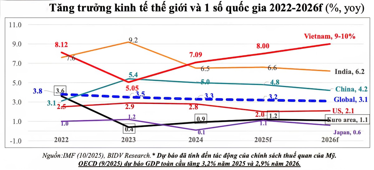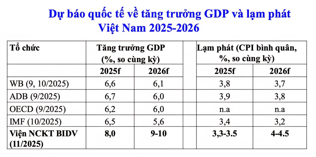 Về triển vọng tăng trưởng GDP Việt Nam giai đoạn 2025 - 2026, các tổ chức như World Bank, ADB, OECD và IMF đã đưa ra mức dự báo thận trọng cho năm 2025 dao động từ 6,2% đến 6,7% và năm 2026 từ 5,6% đến 6,1%. Trái lại, Viện Nghiên cứu Kinh tế BIDV đã đưa ra dự báo lạc quan hơn nhiều với mức tăng trưởng GDP năm 2025 là 8% và bứt phá lên mức 9 - 10% vào năm 2026, miễn là không có thiên tai bất thường.