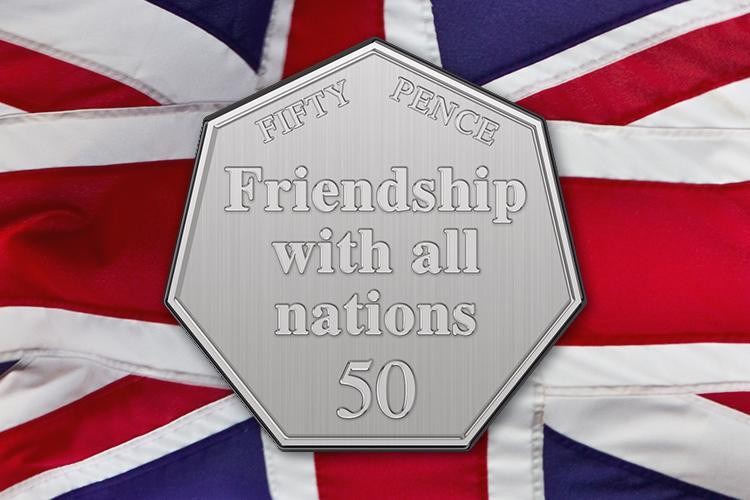 Theo Sở Đúc tiền Hoàng gia Anh, đồng 50 xu mới có khắc hình ảnh Nữ hoàng ở một mặt, mặt còn lại khắc dòng chữ "Friendship with all nations - Hòa bình, thịnh vượng và tình hữu nghị với tất cả các dân tộc".