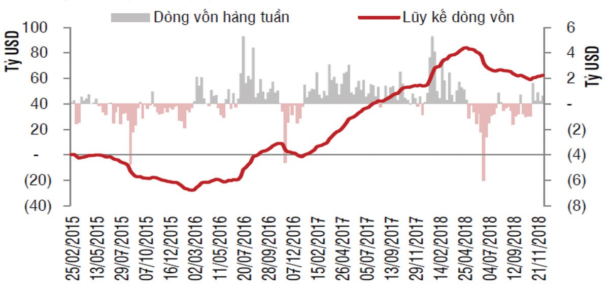 Việc dòng tiền rút ra này là tín hiệu tiêu cực ban đầu đối với các thị trường mới nổi. Hiện lãi suất của Fed đang ở mức 2,25%/năm, tăng 1 điểm phần trăm kể từ đầu năm 2018 và có thể đứng ở mức 2,5% tại thời điểm kết thúc năm 2018. Fed cũng hé lộ có thể sẽ có 3 lần tăng lãi suất trong năm 2019, trong khi các chuyên gia nhận định, năm 2019 có thể có ít hơn 3 lần tăng lãi suất.