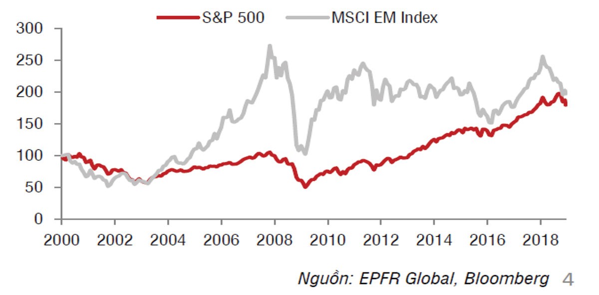 Sự sụt giảm của dòng vốn kéo theo sự sụt giảm rất nhanh của các chỉ số chứng khoán, vì thống kê cho thấy, các chỉ số tại thị trường mới nổi thường biến động rất mạnh theo đúng nghĩa “rủi ro cao – lợi nhuận lớn” (high risk – high return), trong khi các thị trường đã phát triển biến động trong biên độ nhỏ hơn. Giai đoạn từ đầu năm 2018 tới nay, chỉ số MSCI các thị trường mới nổi biến động giảm khá mạnh so với S&P 500.