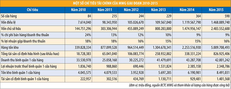 Nhìn vào quá trình phát triển của Công ty kể từ năm 2010 đến nay, MWG có thể được coi là hiện tượng của doanh nghiệp tăng trưởng. Cuối năm 2010, Công ty chỉ có 84 cửa hàng, với tổng doanh thu thuần đạt hơn 2.816 tỷ đồng, lợi nhuận trước thuế 154 tỷ đồng. Đến hết năm 2015, tổng số cửa hàng đã vượt con số 590, doanh thu gấp xấp xỉ 9 lần và lợi nhuận gấp gần 15 lần.