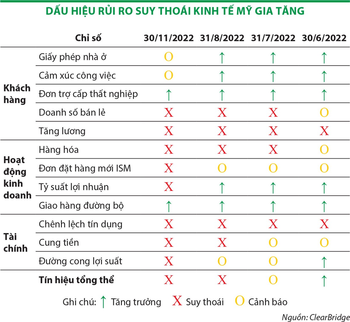 Theo bảng dự báo rủi ro suy thoái kinh tế, có 8 trong số 12 chỉ số cơ bản đang báo hiệu suy thoái, bao gồm cả những dấu hiệu báo trước suy thoái truyền thống.