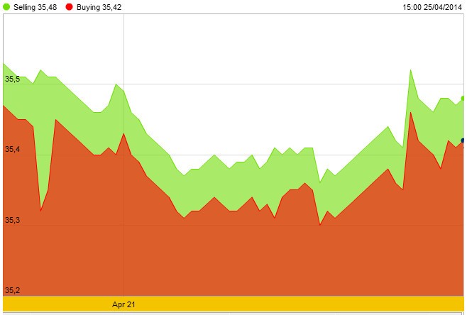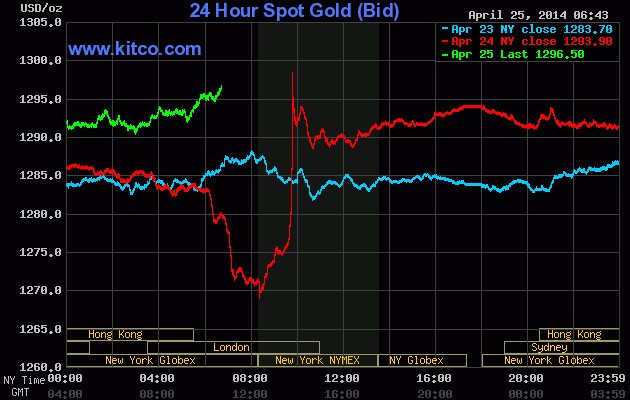 Sau khi lao thẳng xuống mức thấp nhất trong vòng 10 tuần với 1.269,2 USD, giá vàng đã tăng vọt trở lại sau khi nhận được sự hỗ trợ từ căng thẳng leo thang ở Ukraine và cầu vàng vật chất cải thiện ở Trung Quốc. Tính đến 4h30 chiều này, giá vàng thế giới giao ngay ở mức 1.295 USD/ounce.