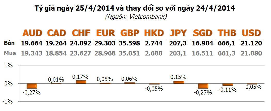 Các ngoại tệ khác không thay đổi nhiều so với hôm qua. Ở chiều giảm, AUD và SGD cùng giảm mạnh nhất với -0,27%; ở chiều tăng, hai ngoại tệ dẫn đầu là CHF và JPY với tương ứng 0,17% và 0,15%.