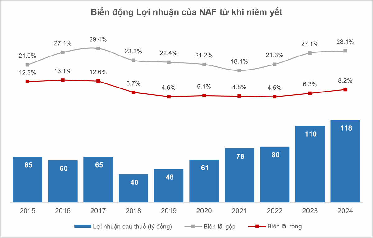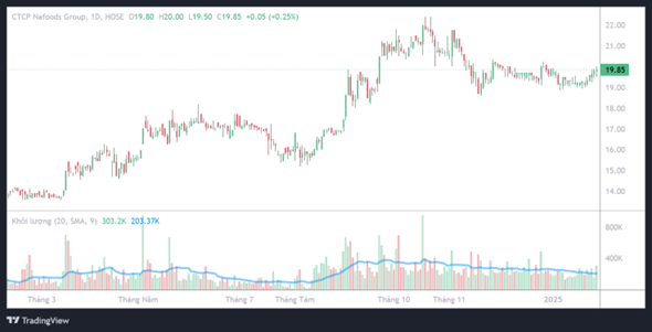 Trên thị trường chứng khoán, kết phiên giao dịch ngày 4/2/2025, cổ phiếu NAF đóng cửa ở mức 19.850 đồng/cổ phiếu. Vốn hóa thị trường đạt 1.104 tỷ đồng, tăng 43,6% so với 1 năm trước.
