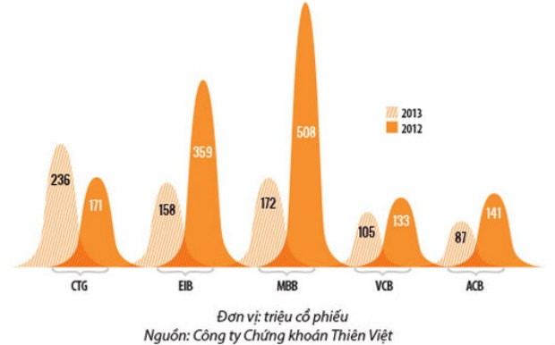 Khối lượng giao dịch cổ phiếu ngân hàng 2013 giảm mạnh so với 2012