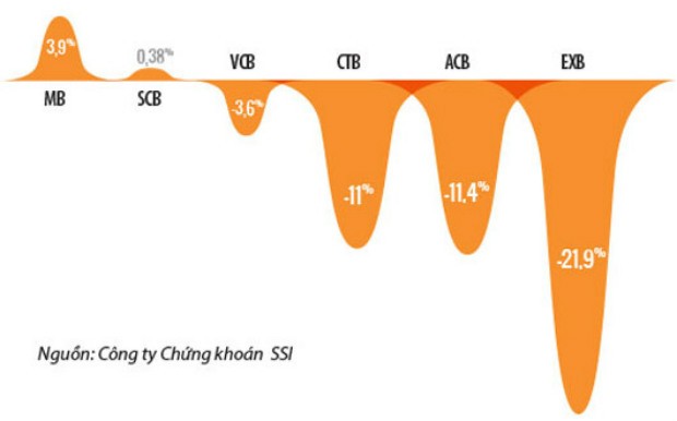 Chỉ riêng Ngân hàng Quân Đội (MB) và Sacombank là có mức giá cổ phiếu cuối năm 2013 tăng so với đầu năm, với mức tăng lần lượt là 3,9% và 0,38%. Còn lại, giá cổ phiếu của những ngân hàng khác đều giảm, như VCB (3,6%), CTG (11%), ACB (11,4%) hay Eximbank (21,9%), theo số liệu của SSI.