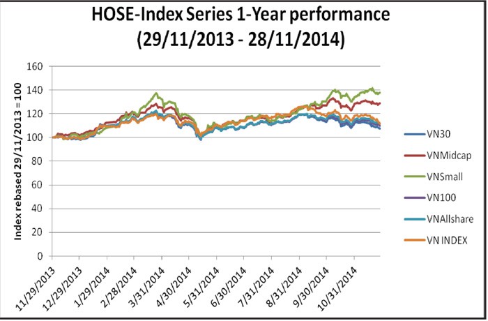 Chỉ số VNSmallcap có mức tăng trưởng tốt nhất trong nhóm HOSE Index, cuối ngày 25/12/2014, chỉ số này đạt 668,49 điểm, tăng 137,15 điểm, tương đương 25,81% so với ngày 02/01/2014, cùng kỳ năm ngoái, VNSmallcap tăng 122,53 điểm, tương đương 29,47%. VNSmallcap đạt mức cao nhất ở 744,71 điểm (20/11/2014) và mức thấp nhất ở 526,68 điểm (13/05/2014).