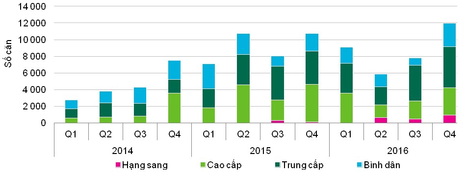 Vào quý cuối năm 2016, số lượng căn hộ bán được là 11.941 căn, tăng 52% so với quý trước và 11% so với cùng kỳ năm trước. Cả năm 2016 ghi nhận tổng cộng 35.008 căn bán ra, giảm 4% so với năm trước. Số lượng các căn bán ra gần bằng số lượng các căn được chào bán, chủ yếu đến từ các dự án mới. Thị phần trung cấp tiếp tục tiến triển tốt với hơn 15.270 căn bán ra trong cả năm, chiếm hơn 40% tổng số căn được bán.