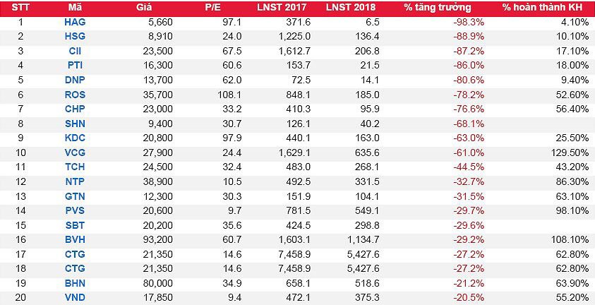 Top 20 doanh nghiệp giảm lợi nhuận năm 2018 (Vốn hóa: HOSE > 3.000 tỷ; HNX > 1.000 tỷ)