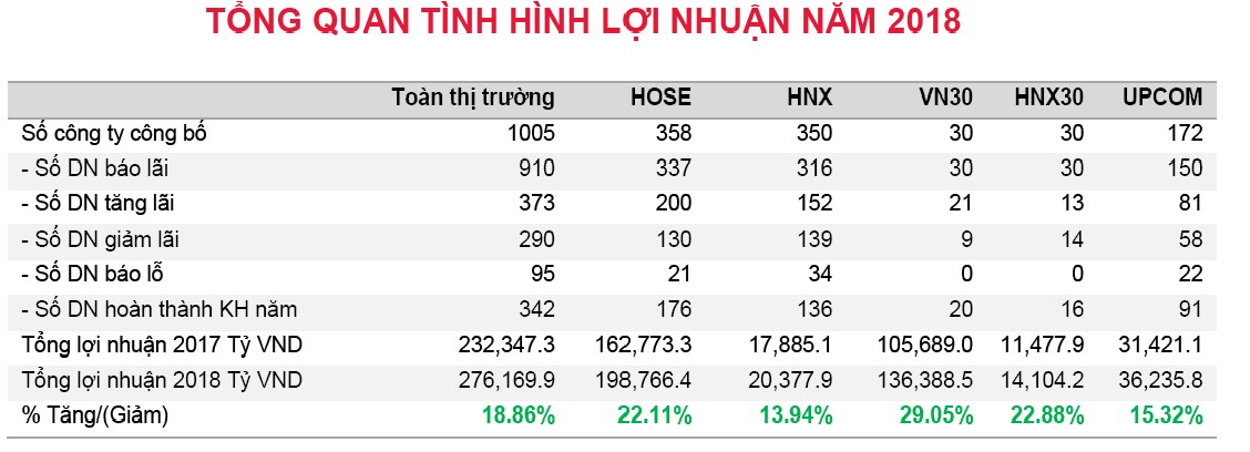 Tổng lợi nhuận ròng cả năm 2018 các doanh nghiệp công bố đạt khoảng 276,2 nghìn tỷ đồng, tăng trưởng 18,9% so với năm 2017. Tuy nhiên nếu loại trừ lợi nhuận đột biến của VHM (tăng gần 13.000 tỷ đồng lợi nhuận) thì con số này chỉ tăng trưởng 13,3%.