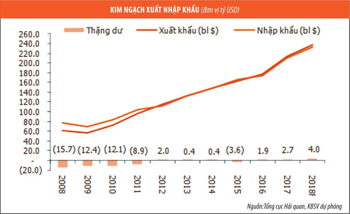 KBSV dự báo, kim ngạch xuất nhập khẩu tiếp tục duy trì mức tăng trưởng khoảng 10,8% trong năm 2018 với trạng thái thặng dư, trong đó xuất khẩu ước đạt 237,3 tỷ USD, tăng 11% và nhập khẩu ước đạt 233,3 tỷ USD, tăng 10,5% so với năm 2017.