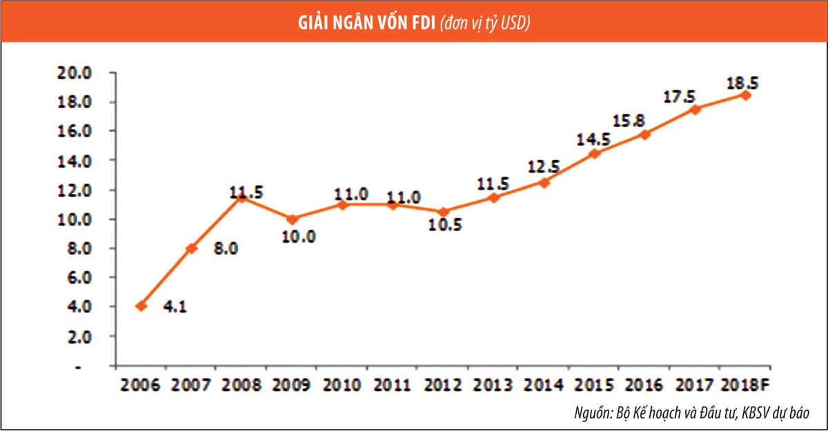 Một trong những nguồn lực hỗ trợ đà tăng trưởng tích cực của nền kinh tế chính là dòng FDI đạt mức cao kỷ lục và dự báo tiếp tục leo dốc. Theo đó, dòng vốn FDI từ các nhà đầu tư quốc tế tăng mạnh vào Việt Nam, giải ngân năm 2017 đạt 17,5 tỷ USD là mức kỷ lục trong hơn 30 năm mở cửa của nền kinh tế và thu hút dòng vốn này. Hàn Quốc là quốc gia đầu tư lớn nhất vào Việt Nam, tiếp theo là Nhật Bản và Singapore…, tập trung chính vào lĩnh vực sản xuất, cơ sở hạ tầng, bán lẻ và bất động sản.