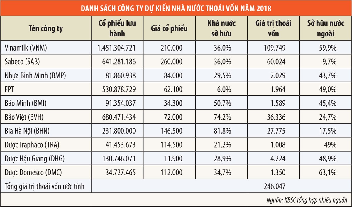 Trong khi đó, một trong những điểm nhấn của thị trường năm 2018 là xuất hiện nhiều cơ hội đầu tư mới hấp dẫn, xuất phát từ việc tiếp tục đẩy mạnh thoái vốn và cổ phần hóa các doanh nghiệp nhà nước. Với tổng giá trị thoái vốn dự kiến tại các công ty niêm yết lớn như Vinamilk, Sabeco, FPT…, ước tính nhà đầu tư cần khoảng 246.047 tỷ đồng, tương ứng gần 11 tỷ USD để hấp thụ lượng vốn bán ra này.