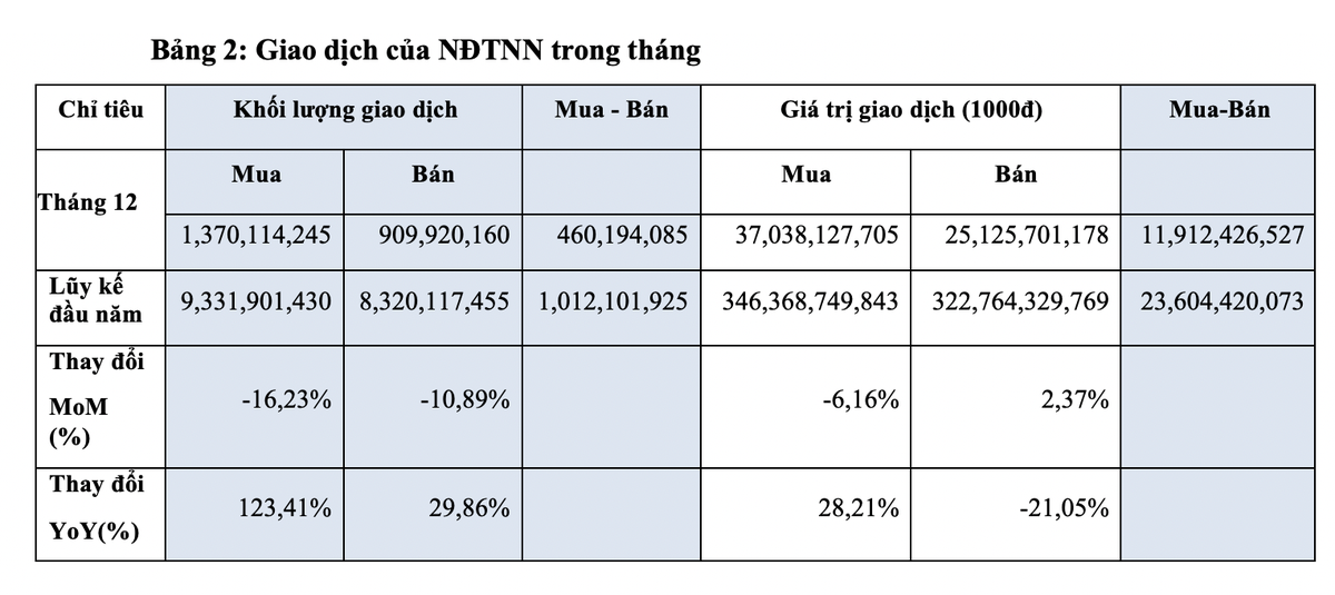 Điểm sáng năm nay là hoạt động khối ngoại, tổng giá trị giao dịch đạt gần 670.000 tỷ đồng, chiếm hơn 7,9% tổng giá trị giao dịch cả chiều mua và bán của toàn thị trường. Nhà đầu tư nước ngoài đã thực hiện mua ròng trong năm với giá trị hơn 23.600 tỷ đồng.