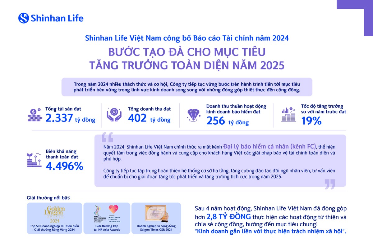 Cụ thể, Shinhan Life Việt Nam đã ra mắt kênh đại lý bảo hiểm cá nhân (FC Channel) vào đầu năm 2024. Sự kiện này thể hiện quyết tâm mạnh mẽ của công ty trong việc đồng hành và cung cấp cho khách hàng Việt các giải pháp bảo vệ tài chính toàn diện và phù hợp nhất. Cũng trong năm 2024, công ty chính thức chuyển về trụ sở mới chung tòa nhà với các công ty thuộc Tập đoàn tài chính Shinhan tại Việt Nam nhằm tối ưu hiệu quả hợp tác giữa các bên, mang lại những dịch vụ tài chính chất lượng. Bên cạnh hoạt động kinh doanh, công ty luôn cam kết sẽ tiếp tục nối dài hành trình “Gửi trao diệu kỳ” thông qua các chương trình thiện nguyện, sáng kiến vì cộng đồng thiết thực.