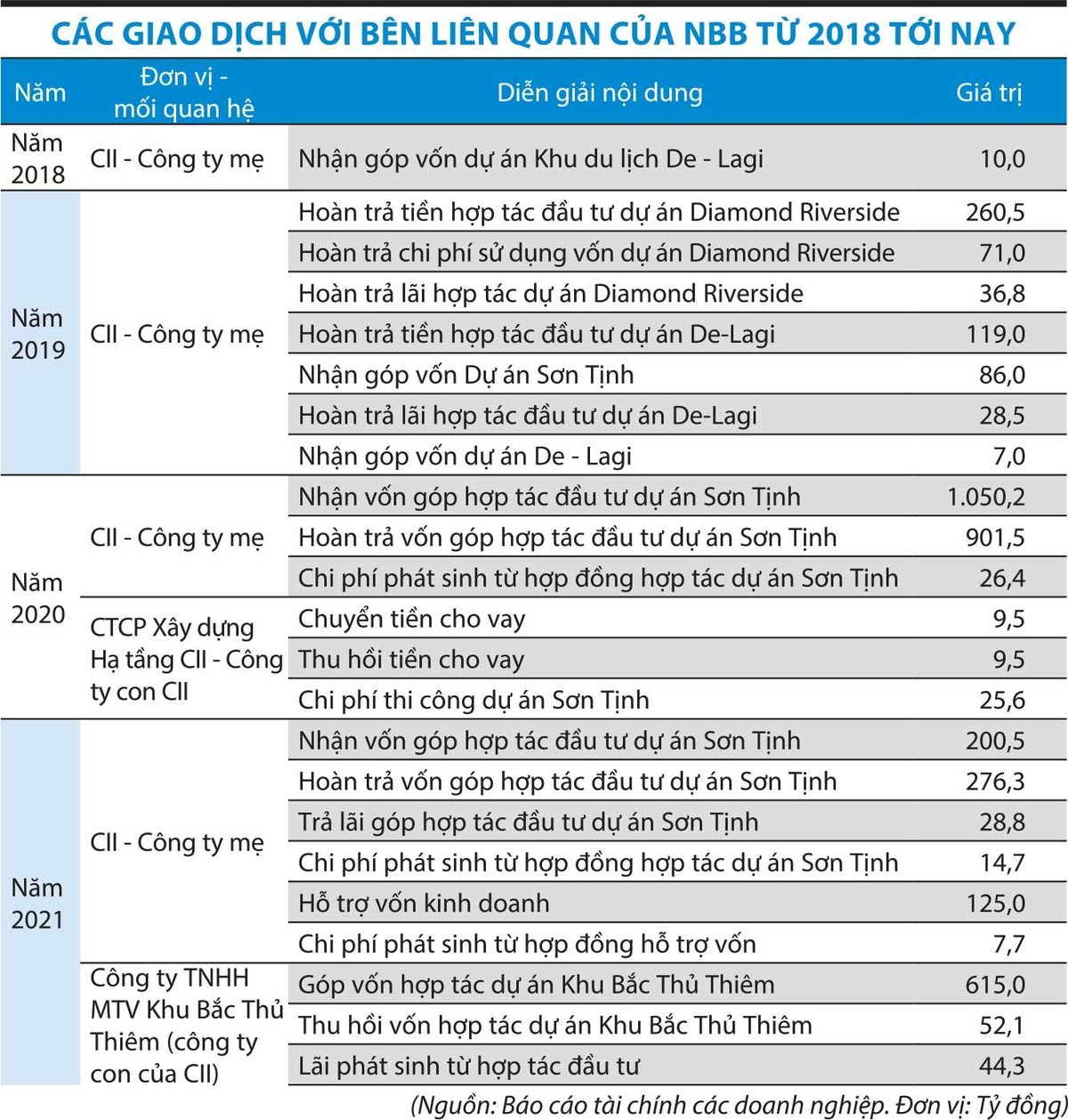 Kể từ khi trở thành công ty mẹ của NBB từ năm 2019 tới nay, CII đã thực hiện nhiều giao dịch qua lại với công ty này. Cụ thể, CII thực hiện góp vốn triển khai các dự án như Diamond Riverside, De-Lagi, Sơn Tịnh, hay mang tiền của NBB góp vốn hợp tác dự án khu Bắc Thủ Thiêm, sau đó tiếp tục bán các dự án đầu tiên trong khu Bắc Thủ Thiêm cho đối tác trước khi dự án kịp hoàn thành và bàn giao cho khách hàng.