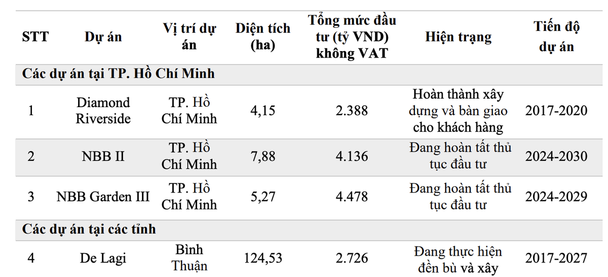 Trong đó, đối với dự án Diamond Riverside, Công ty sẽ hoàn thành tính tiền sử dụng đất; Đối với dự án NBB II, công ty sẽ hoàn thành các thủ tục pháp lý chấp thuận chủ trương đầu tư, phê duyệt 1/500 của dự án; Đối với dự án NBB Garden III, Năm Bảy Bảy sẽ hoàn thành công tác điều chỉnh phê duyệt 1/500, chuyển mục đích sử dụng đất, tính tiền sử dụng đất và xin giấy phép xây dựng; Đối với dự án De Lagi - Bình Thuận, Công ty sẽ thi công san lấp và hạ tầng kỹ thuật trên phần diện tích đã được Nhà nước giao đất, tiếp tục đẩy nhanh công tác kiểm kê, đền bù dự án trên phần diện tích đất còn lại chưa giao, gia hạn tiến độ thực hiện dự án.