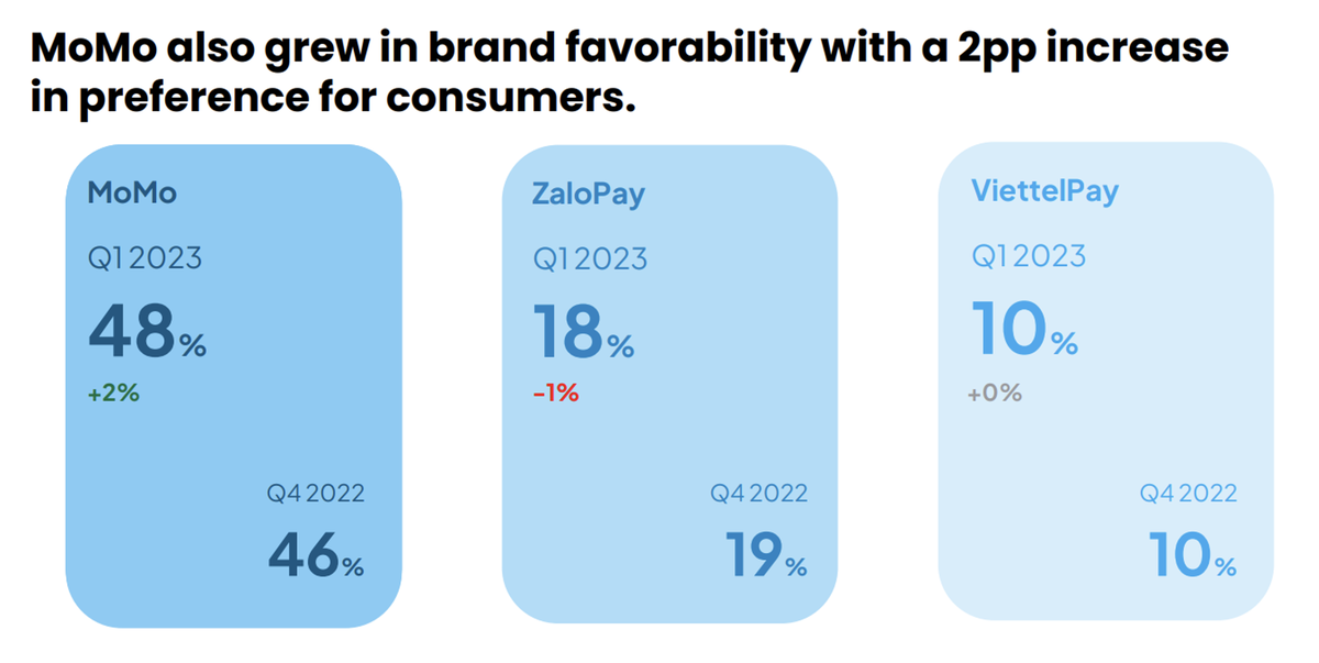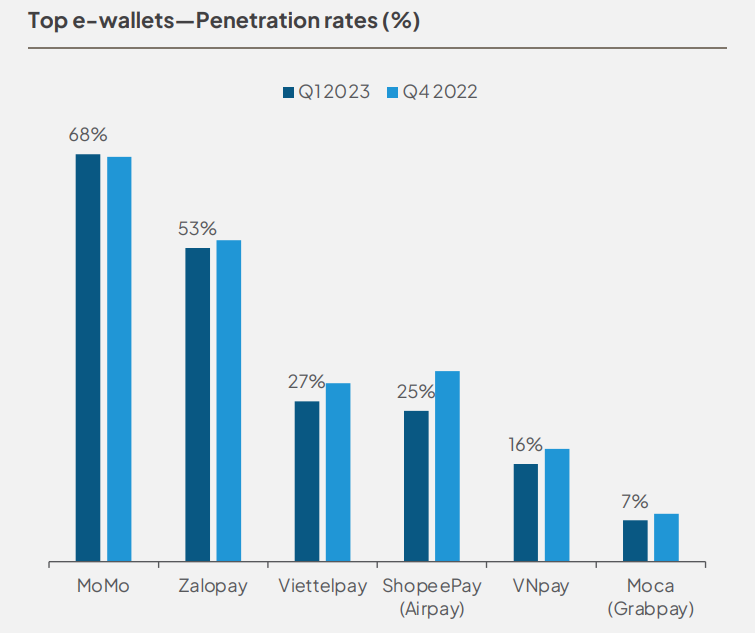 Theo báo cáo “Người tiêu dùng số - The Connected Consumer” quý I/2023, MoMo chiếm 68% thị phần (penetration rates) ví điện tử, trong khi đó các thương hiệu khác đều đang giảm so với quý IV/2022.