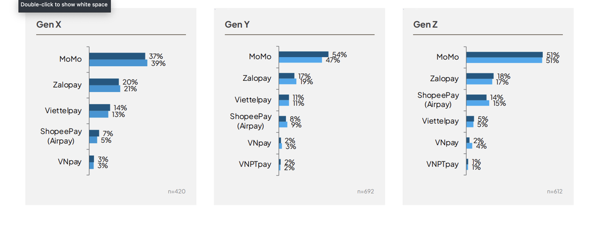 Đặc biệt, MoMo chiếm thế thượng phong khi có mức độ yêu thích cao hơn 50% đối với hai nhóm người dùng Gen Z (từ 16-25 tuổi) và Gen Y (từ 26-41 tuổi), với tỷ lệ lần lượt là 51% và 54%.