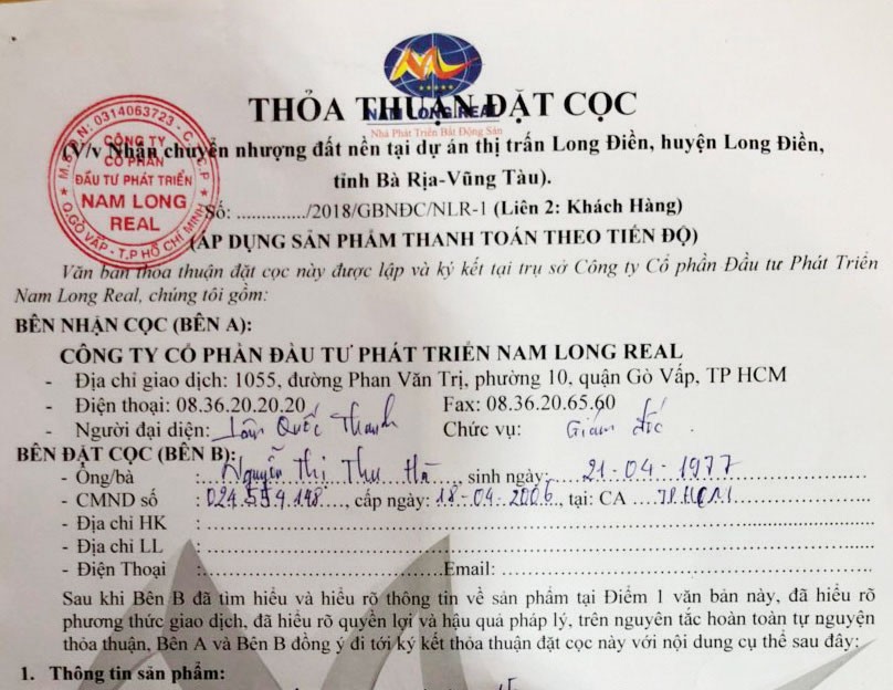 Điều khiến anh Trường và các khách hàng khác của Nam Long Real lo lắng, đó là việc đơn vị này không phải chủ sở hữu của các lô đất nền đem bán.