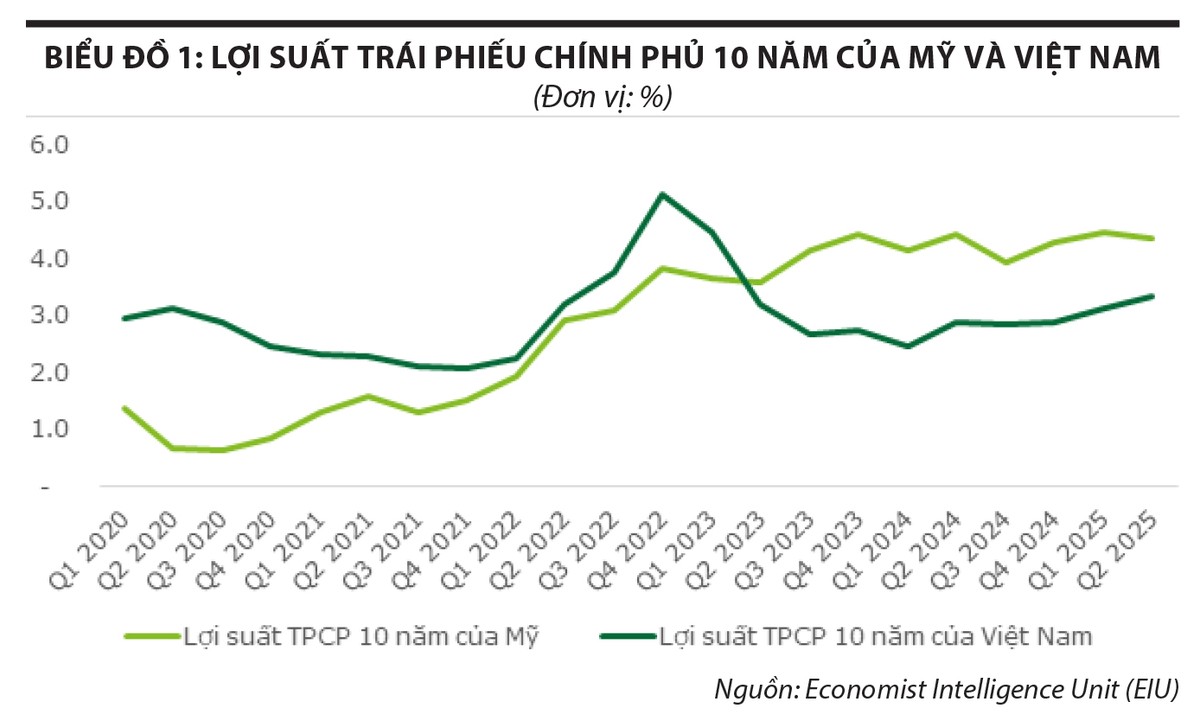 Biểu đồ 1 cho thấy sự thay đổi sâu sắc khi lãi suất trái phiếu chính phủ Mỹ cao hơn đáng kể so với lãi suất trái phiếu chính phủ Việt Nam và duy trì tình trạng này từ năm 2023.