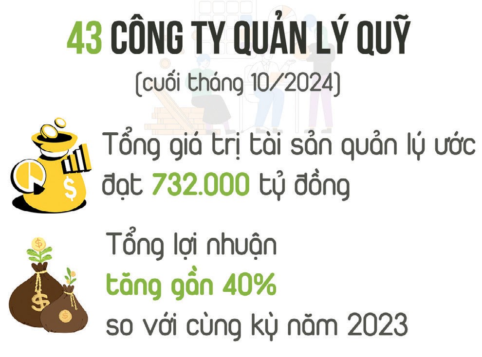 Năm 2024, hoạt động kinh doanh của các công ty quản lý quỹ cũng có sự tăng trưởng về quy mô và hiệu quả. Tại thời điểm 31/10/2024, tổng giá trị tài sản quản lý của 43 công ty đang hoạt động ước tính đạt 732.000 tỷ đồng, tăng gần 10% so với cuối năm 2023; tổng lợi nhuận tăng gần 40% so với cùng kỳ năm 2023.