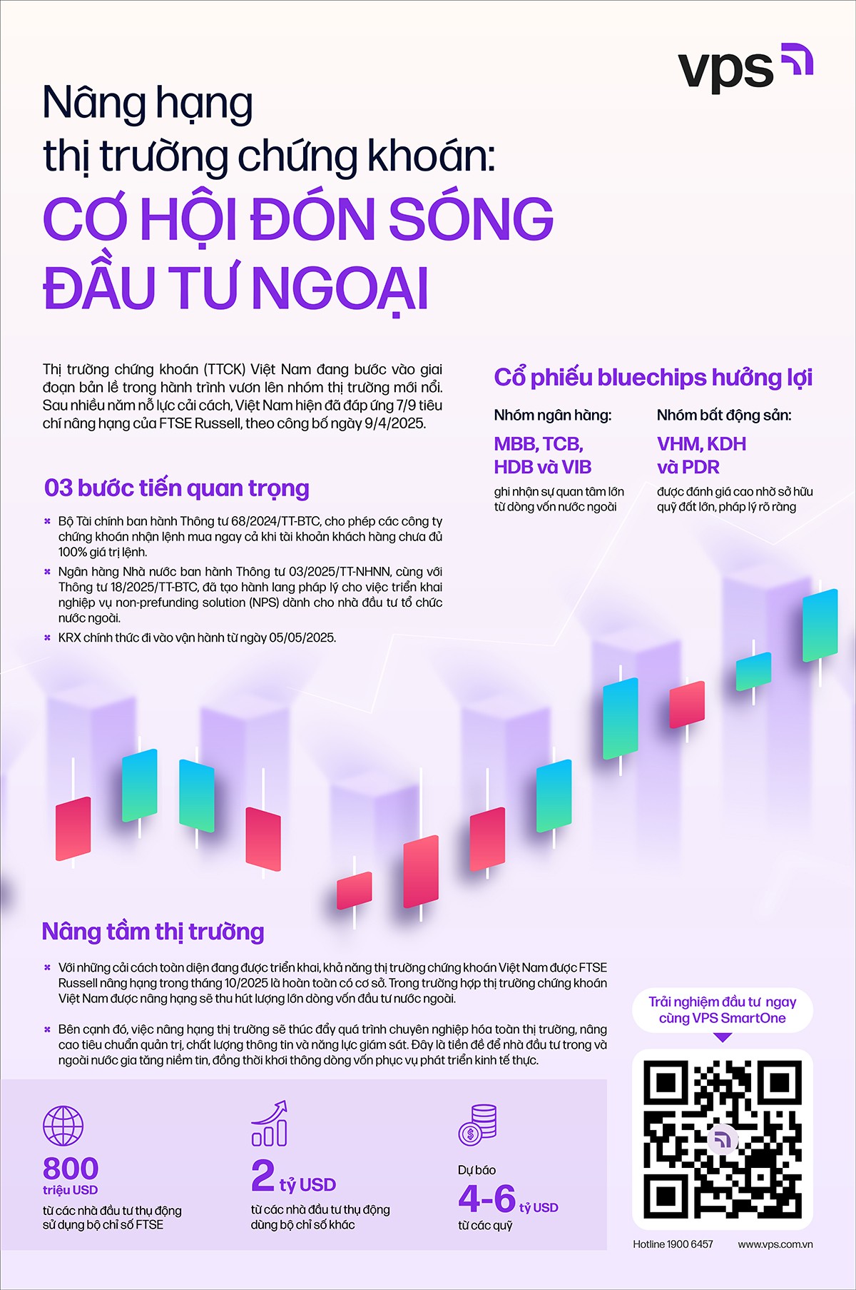 Với những cải cách toàn diện đang được triển khai, khả năng TTCK Việt Nam được FTSE Russell nâng hạng trong tháng 10/2025 là hoàn toàn có cơ sở. Trong trường hợp TTCK Việt Nam được nâng hạng từ cận biên lên mới nổi có thể giúp thu hút 800 triệu USD từ các nhà đầu tư thụ động sử dụng bộ chỉ số FTSE và khoảng 2 tỷ USD từ các nhà đầu tư thụ động dùng bộ chỉ số khác. Đồng thời, khi thị trường nâng hạng, các quỹ chủ động sẽ tham gia tích cực hơn, dự kiến sẽ có thể có khoảng 4-6 tỷ USD vào Việt Nam. Dòng tiền này sẽ tăng cường thanh khoản thị trường, giúp giao dịch khớp lệnh nhanh và ổn định hơn, đồng thời đẩy định giá cổ phiếu lên mức hợp lý, phản ánh đúng giá trị doanh nghiệp.