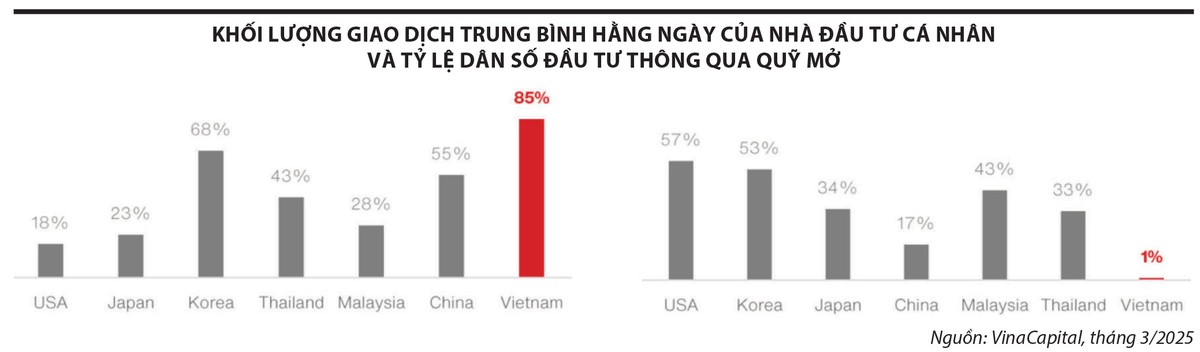 Tính đến cuối năm 2024, tỷ lệ dân số đầu tư thông qua quỹ mở tại Việt Nam mới đạt khoảng 1%. Sang năm 2025, dù ghi nhận số lượng nhà đầu tư tổ chức gia nhập mới tăng mạnh, với gần 1.500 tài khoản được đăng ký mới, tổng số nhà đầu tư tổ chức (bao gồm trong nước và nước ngoài) cũng chỉ đạt khoảng 23.800 - một con số rất nhỏ so với hơn 11,5 triệu tài khoản nhà đầu tư đang hiện diện trên thị trường.