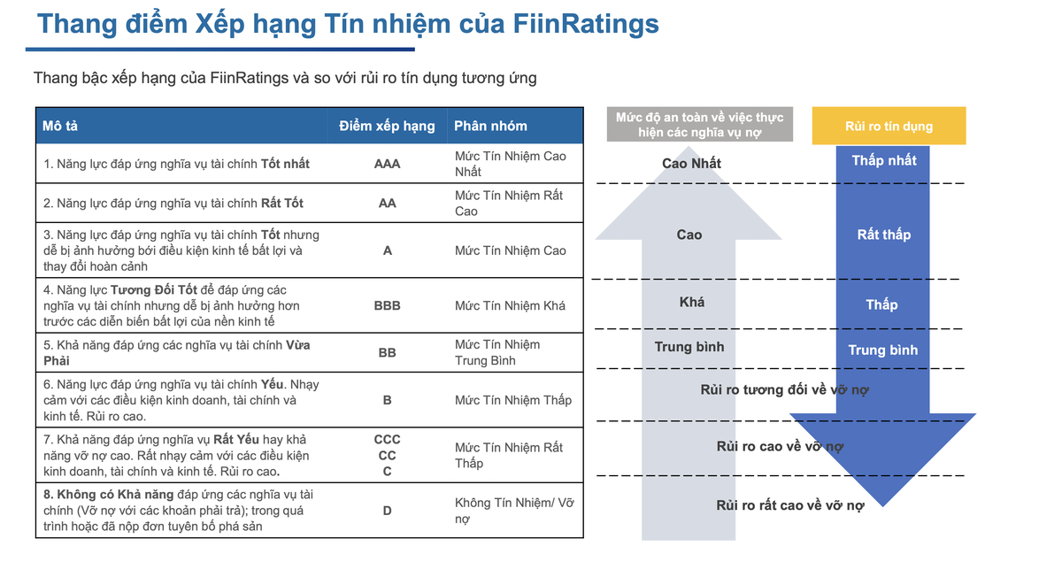 Mức lãi suất trên 10%/năm: Được nhà đầu tư chấp nhận cho các nhà phát hành có mức xếp hạng BB hoặc B trở xuống. Đây là mức thể hiện khả năng đáp ứng nghĩa vụ tài chính ở mức Trung bình. Hiện có 21 trong tổng số 52 đơn vị trong mẫu xếp hạng, và 7 doanh nghiệp có kết quả xếp hạng ở mức BB hoặc B trở xuống.
