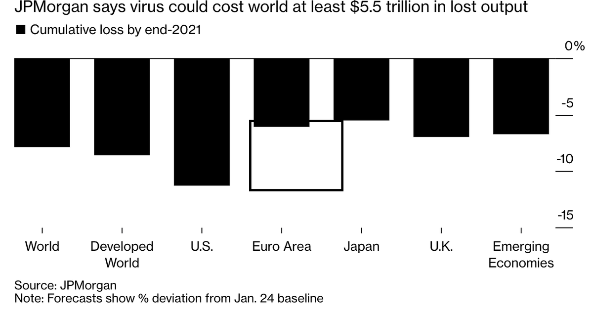 Các nhà kinh tế của JPMorgan Chase & Co. đưa ra tổng sản lượng bị mất ở mức 5,5 nghìn tỷ USD hoặc gần 8% GDP vào cuối năm tới. Trong đó, chỉ riêng chi phí cho các nền kinh tế phát triển sẽ tương tự như những gì đã chứng kiến trong các cuộc suy thoái năm 2008-2009 và 1974-1975.