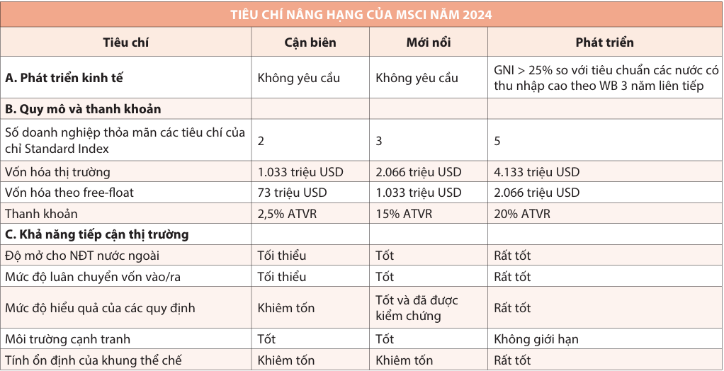 Ngày 20/6/2024, MSCI sẽ công bố chính thức kết quả phân loại quốc gia, tuy nhiên với tiêu chí về công bố thông tin và nhiều tiêu chí khác chưa được cải thiện, có lẽ khả năng cao thị trường chứng khoán Việt Nam lại tiếp tục lỡ hẹn với kế hoạch nâng hạng.