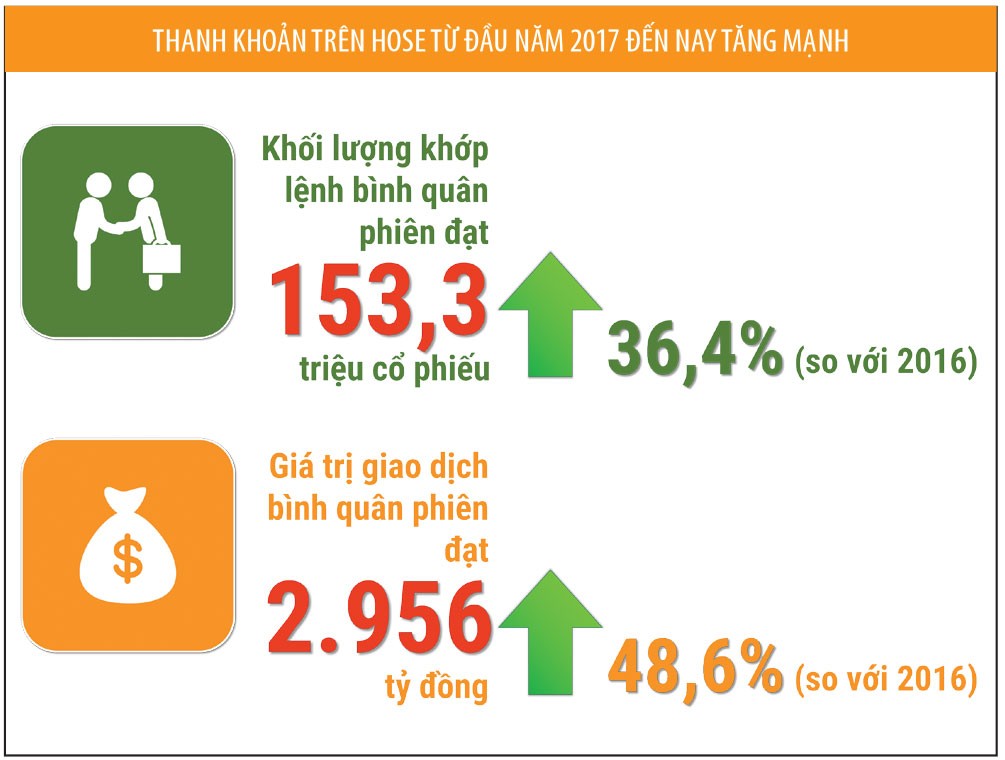 Xét thanh khoản của thị trường, tính từ đầu năm đến ngày 9/5, khối lượng khớp lệnh bình quân phiên đạt 153,3 triệu cổ phiếu, tăng 36,4% so bình quân phiên năm 2016; giá trị giao dịch bình quân phiên đạt 2.956 tỷ đồng, tăng 48,6% so với bình quân phiên năm 2016. Trong khi đó, nhóm nhà đầu tư nước ngoài mua ròng tổng cộng 5.239 tỷ đồng.