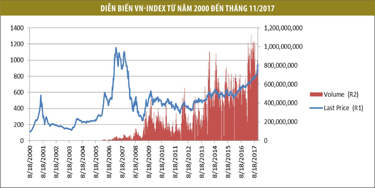 Năm 2018, thị trường chứng khoán Việt Nam cũng đang hội tụ đầy đủ các điều kiện để tăng trưởng mạnh như giai đoạn 2005 – 2007, với hai khả năng xảy ra: Một là, bước vào chu kỳ tăng trưởng trong khoảng 1,5- 2 năm tới và lập lại đỉnh 2007, VN-Index có thể đạt tốc độ tăng tương đương năm 2017 (trên 40%) với thanh khoản cao.