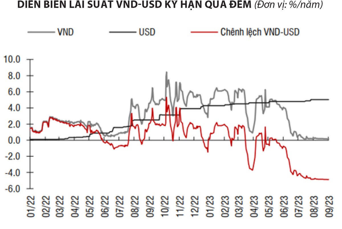 Hiện lãi suất USD của Mỹ đã được nâng lên mức cao. Do đó, kể cả khi ngân hàng trung ương nước này dừng lộ trình tăng lãi suất thì chênh lệch giữa lãi suất VND và USD vẫn còn lớn, nếu Việt Nam tiếp tục giảm lãi suất. Kỳ vọng Cục Dự trữ liên bang Mỹ (Fed) giảm lãi suất trong ngắn hạn là rất khó. Vấn đề quan trọng hiện nay là Fed sẽ giữ mức lãi suất cao như hiện nay trong bao lâu. Ngân hàng Trung ương Mỹ vẫn trong thời kỳ thắt chặt tiền tệ và đeo đuổi mục tiêu kiểm soát lạm phát ở mức 2%. Trong khi đó, lạm phát tháng 7/2023 của Mỹ là 3,2%, tuy có giảm so với dự báo của các chuyên gia kinh tế, song vẫn cao hơn so với mục tiêu.