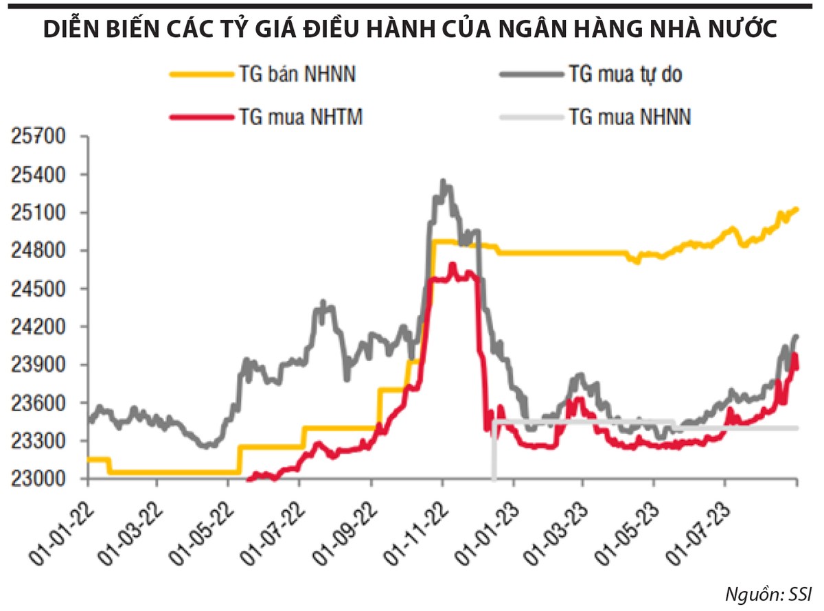SSI cho rằng, biến động của VND nghiêng nhiều về yếu tố mùa vụ và việc Việt Nam duy trì chính sách tiền tệ phân kỳ với các ngân hàng trung ương lớn trên thế giới là yếu tố tạo ra áp lực đối với tỷ giá trong quý III/2023. Điểm tích cực là vị thế của Ngân hàng Nhà nước gia tăng nhờ lượng dự trữ ngoại hối được bổ sung, cũng như nguồn cung ngoại tệ tích cực (FDI giải ngân 8 tháng đầu năm 2023 đạt 13,1 tỷ USD, tăng 1,5% so với cùng kỳ năm ngoái, hay cán cân thương mại ước đạt thặng dư kỷ lục ở mức 20,6 tỷ USD).