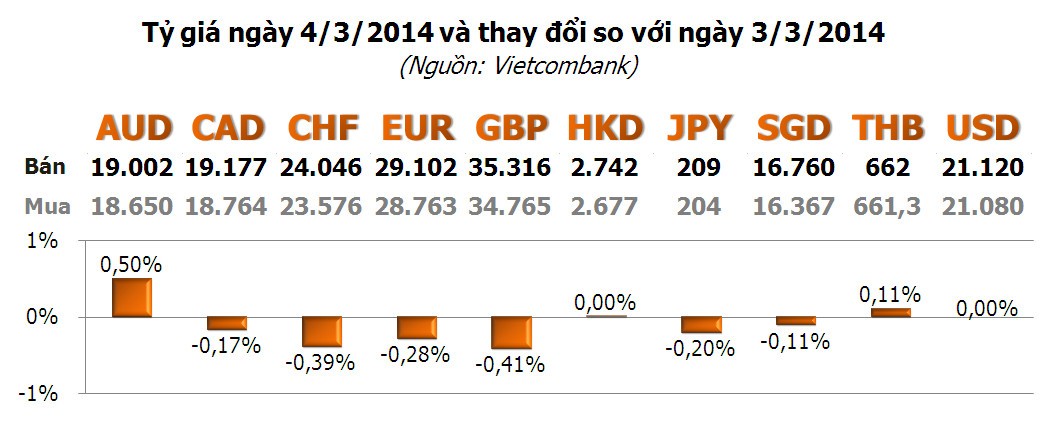 Với các ngoại tệ khác, phần lớn chuyển sang chiều giảm, trong đó, GBP dẫn đầu với -0,41%; tiếp theo là CHF với -0,39%; EUR với -0,28%... Ở chiều tăng, duy nhất AUD tăng đáng kể với 0,50%.